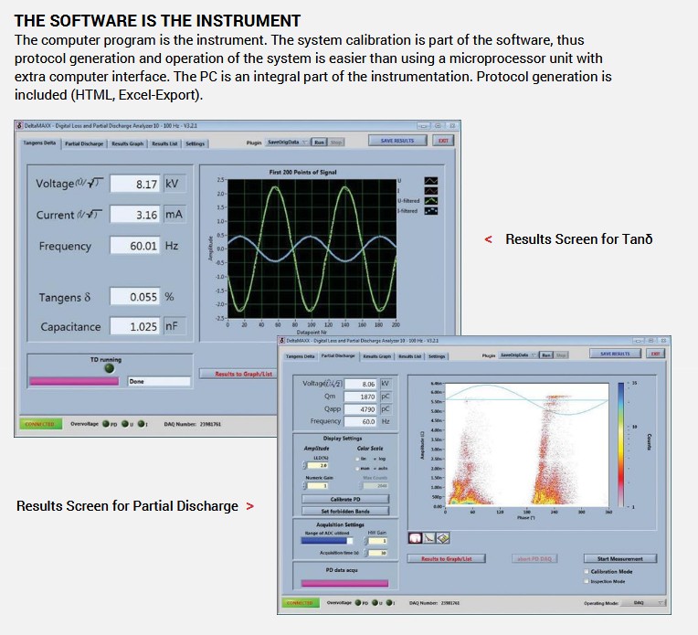 - El PDTech DELTAMAXX es un instrumento ultra compacto para medir pérdidas dieléctricas y capacitancia, con opción de medición de descargas parciales. Un nuevo algoritmo digital de cálculo reemplaza las partes móviles y la estructura frágil de los puentes convencionales de factor de disipación y capacitancia. Puede funcionar con batería y utiliza amplificadores diferenciales, lo que permite una aplicación sencilla tanto en objetos de prueba aterrizados como no aterrizados. El sistema se adapta automáticamente a un amplio rango de frecuencias de prueba y se sincroniza con la frecuencia principal, rechazando los armónicos superiores mediante el nuevo algoritmo. Los armónicos típicos de 3er y 5to orden se eliminan automáticamente. Su robustez frente a perturbaciones externas y su facilidad de uso permiten su adaptación a muchos bancos de prueba de alta tensión más antiguos.