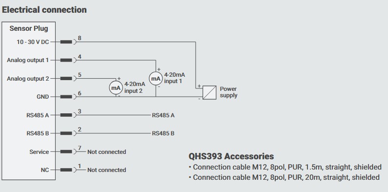 - El sensor QHS393 mide la actividad del agua (a₍w₎), la temperatura del aceite (T) y calcula el contenido absoluto de agua (x). Los valores medidos se entregan a través de dos salidas analógicas de 4–20 mA y una interfaz RS485 con protocolo Modbus RTU.