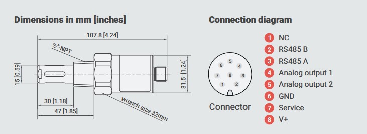 - Conexión eléctrica: Conector macho M12 × 1, enchufe de 8 pines