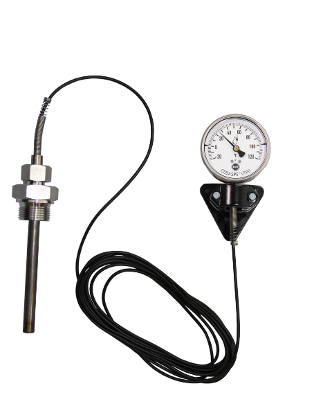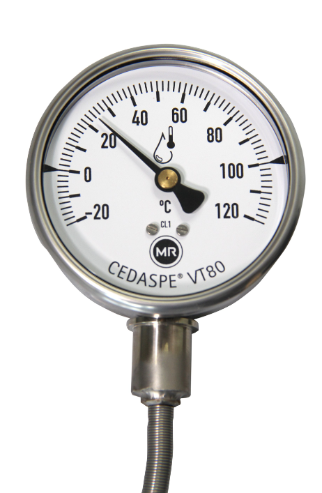 - VT80: Diámetro de 80 mm, sensor Ø12 mm x 124 mm, capilar de acero inoxidable con cubierta de PVC, longitud de 6 m, escala de -20°C a +120°C, clase de protección IP55.